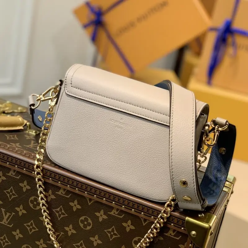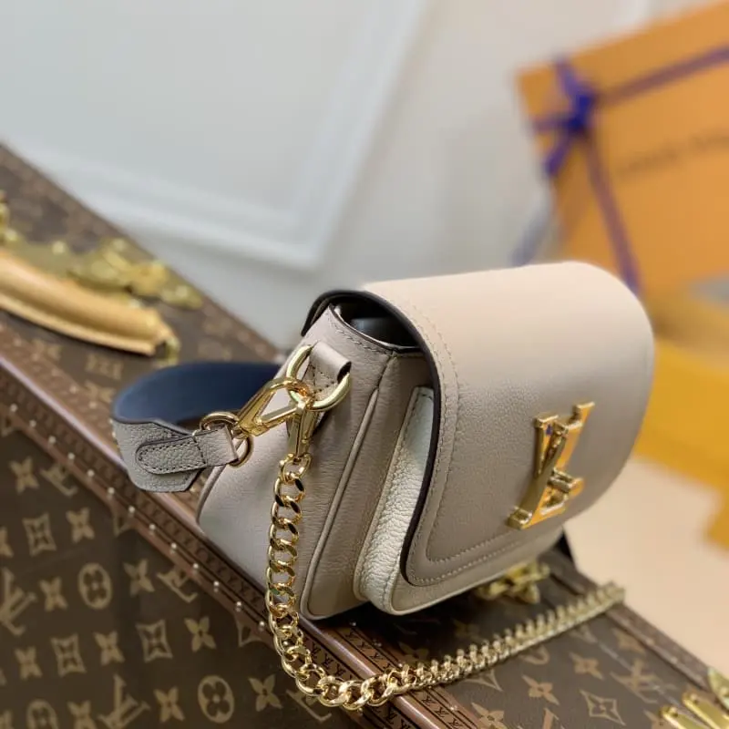 LOCKME TENDER BAG M58554 Apricot The Lockme Tender bag is made of soft grained calfskin and has a metal D-ring for hanging personalized accessories. The wide, removable and adjustable shoulder strap adds practical details to the traditional chain. Dimensions: 19 x 13 x 8 cm (length x height x width)