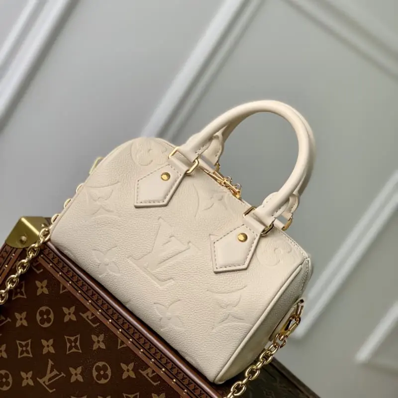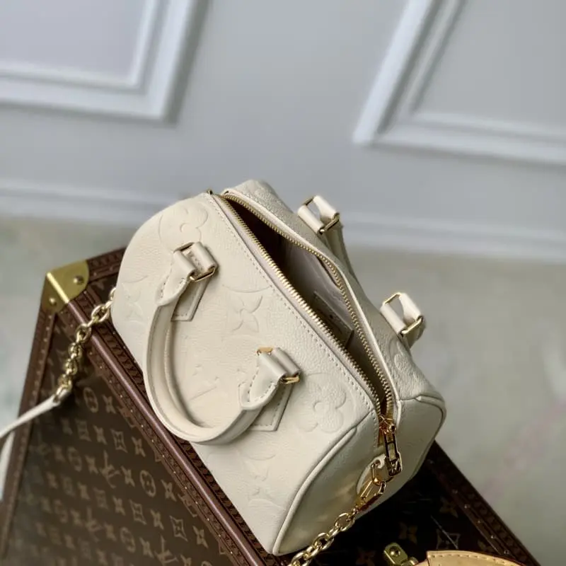 M58953 This Speedy Bandouli??re 20 bag is a compact and stylish bag that can carry your daily necessities. Made of smooth Monogram Empreinte grained leather, it is decorated with a large Monogram embossed with a padlock, hardware, a removable and adjustable chain shoulder strap and Toron handles. 20.5 x 13.5 x 12.0 cm (L x H x W)