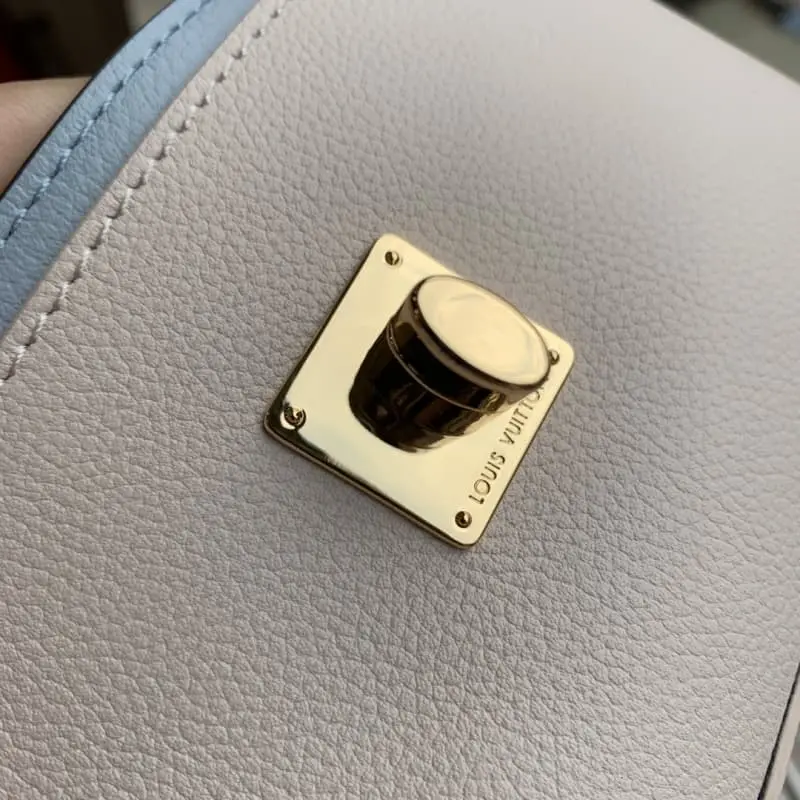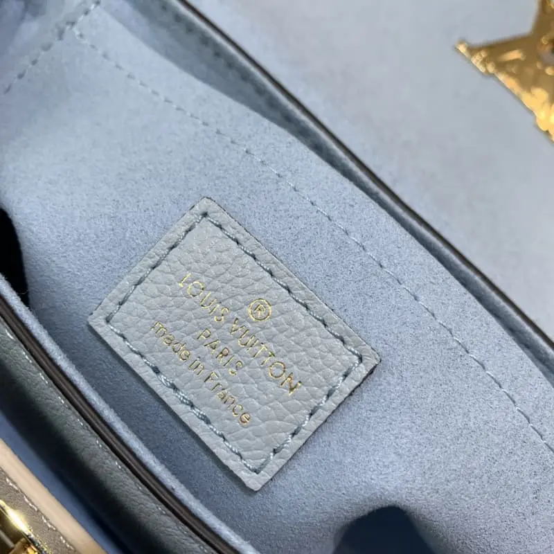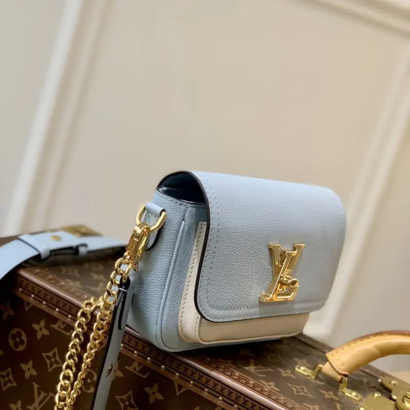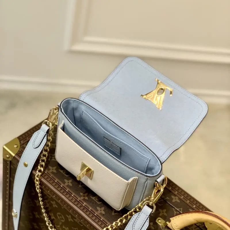 M59984 blue Lockme Tender handbag is made of soft grained cowhide leather. Its metal D-ring can hang personalized accessories. The wide detachable and adjustable shoulder strap adds practical details to the traditional chain. Dimensions: 19.0 x 13.0 x 8.0 cm (length x height x width) –