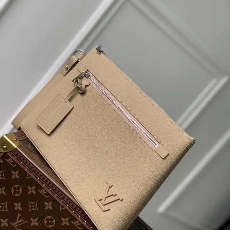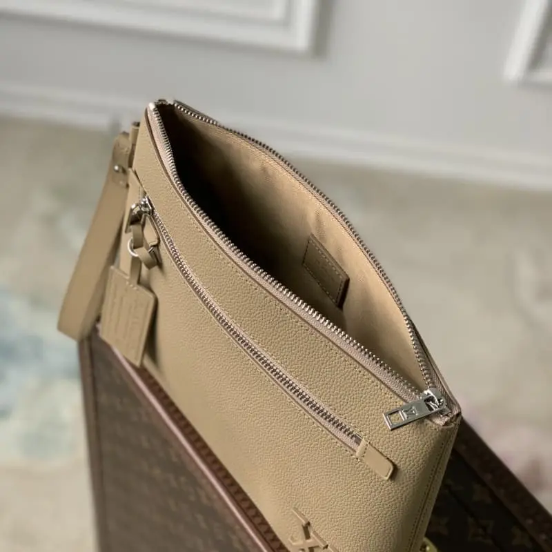 M69837 Earthy Yellow The new LV Aerogram iPad case exudes a trendy style with its restrained design. The soft and delicate calfskin for men is like old-fashioned aviation letterheads. The metal LV letters and customizable labels exude a classic heritage. Elements such as the detachable leather wristband upgrade functionality. Size: 30 x 22 x 5 cm