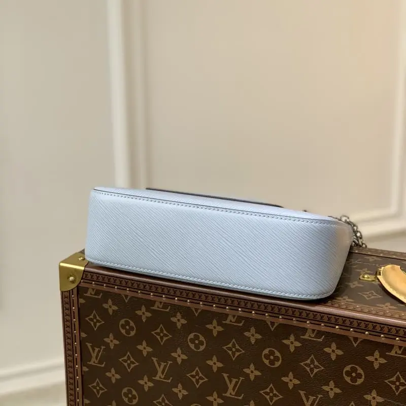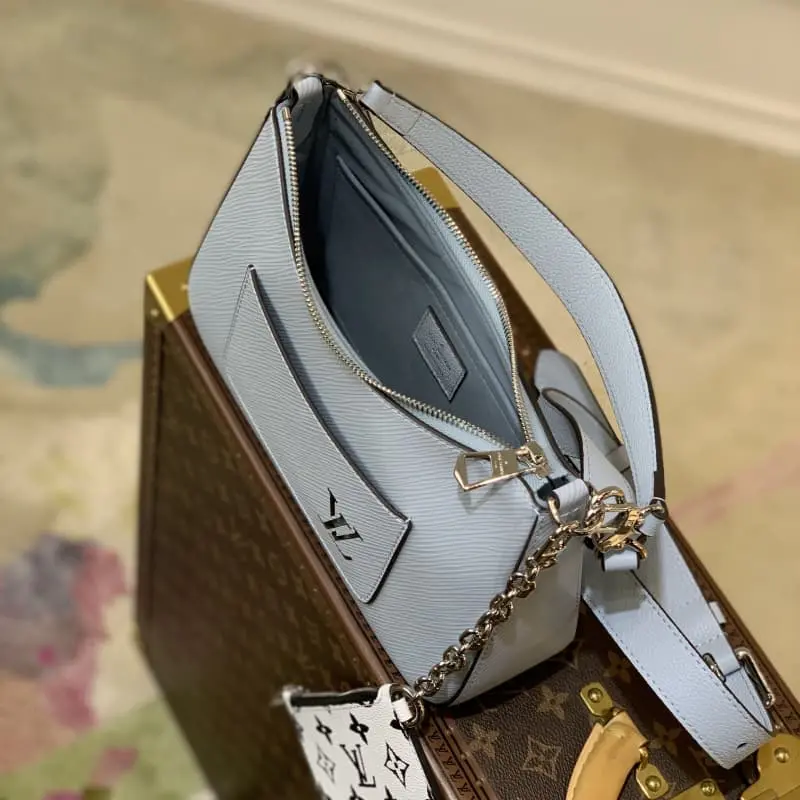 MARELLE handbag M80688 light blue Marelle handbag made of Epi grain leather with chain fastened Detachable canvas zipper pocket in the outer bag Fasten the top handle or adjustable shoulder strap to hold in hand, carry on the shoulder or crossbody Size: 25x15x8cm