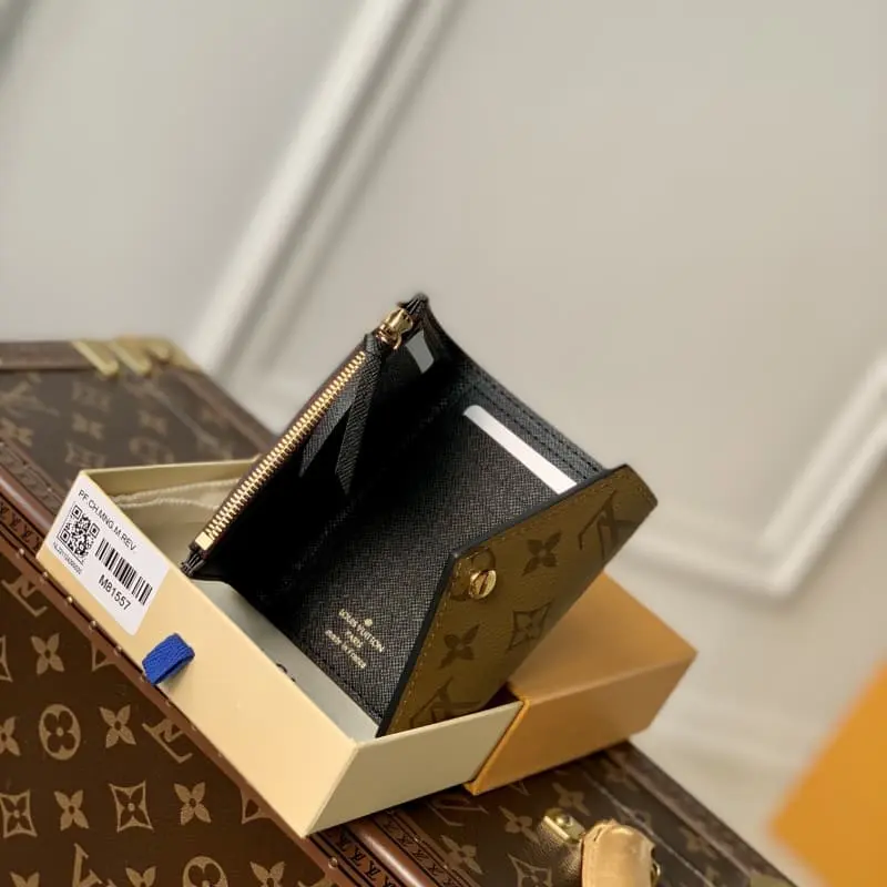 M81557 “Portefeuille Victory” is a combination of Monogram & Monogram Reverse Canvas. The compact Envelop design is equipped with practical features such as a pocket for bills and credit cards, and a coin pocket with a side zipper. The grained leather lining gives a feminine look. Size: 12 x 9.5 x 1.5 cm