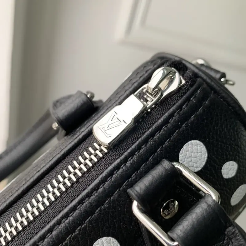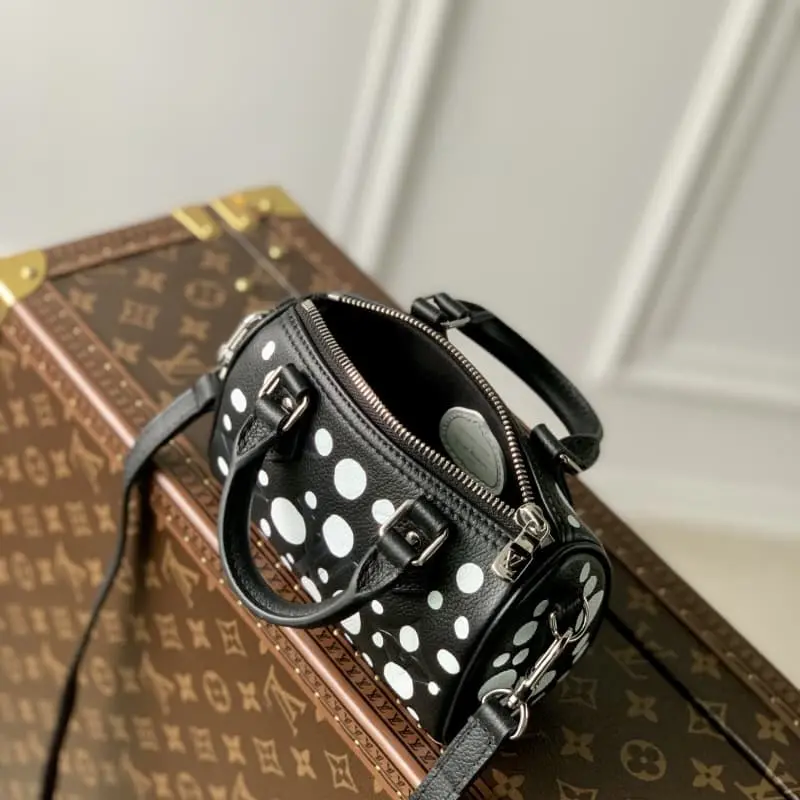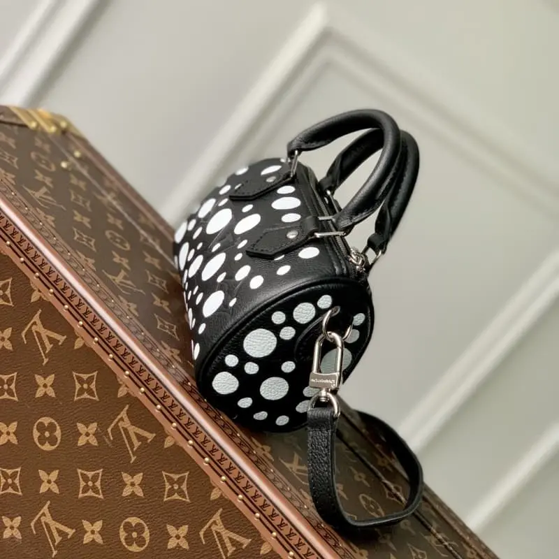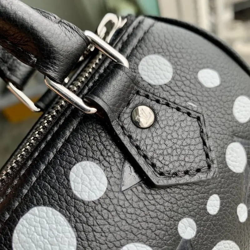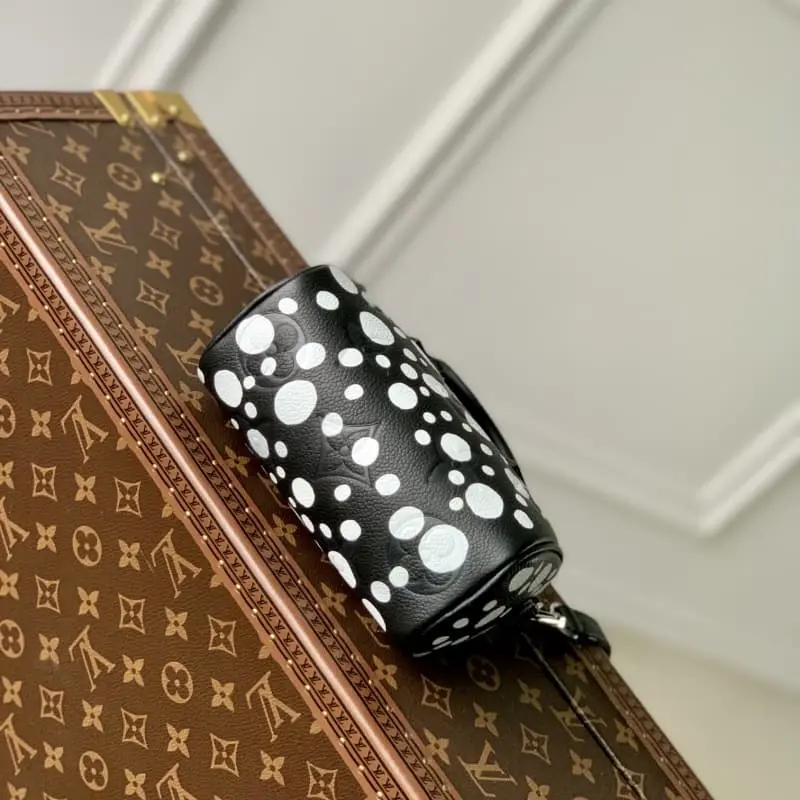 M81910 This LV x YK Nano Speedy bag chooses to express the infinite polka dot theme of the Lbag x Yayoi Kusama collaboration. The famous Japanese artist used the polka dot pattern to symbolize the eternity of time. This time, it is embellished with Monogram embossed calfskin to pay tribute to the elegance and exquisite craftsmanship of this pocket version of the Speedy bag. 16.0 x 10.0 x 7.5 cm (length x height x width)