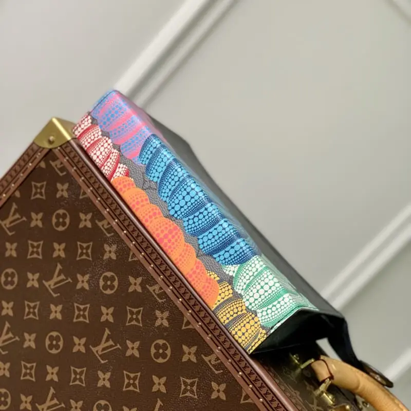M81973 LVxYK Pochette Voyage joins the Lbag x Yayoi Kusama collection with a new look inspired by the famous Japanese artist??s iconic pumpkins. Kusama has been an avant-garde influencer since the 1960s and is obsessed with pumpkins. She loves their warm feel and humorous form. Here they appear on Monogram Eclipse reverse canvas, turning a practical travel bag into an art collector??s item. Dimensions: 27 x 21 x 6 cm