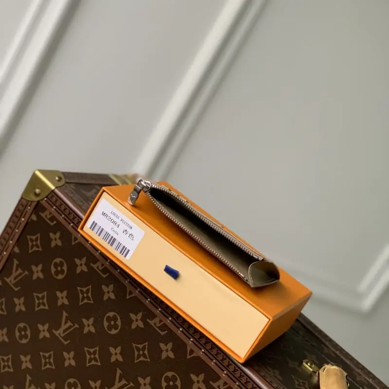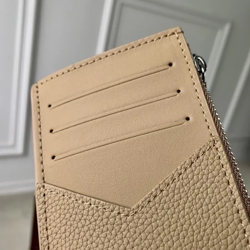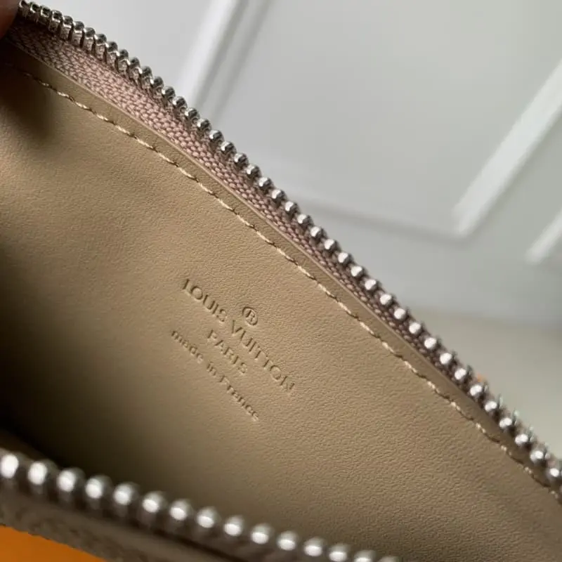M82084 Apricot “coin card holder” made of beautiful cowhide with grain (shibo). The matte LV initials are decorated in the same color as the “LV AEROGRAM” series. In addition to the 4 card slots and zippered compartment for coins, there is also a compartment for bills and receipts. Dimensions: 8 x 14.5 x 1 cm