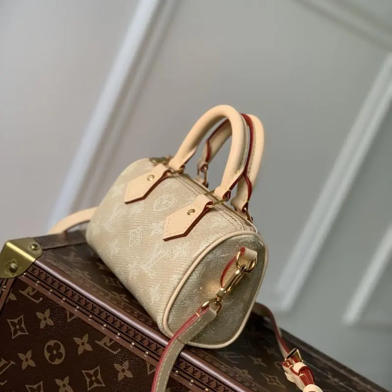 M82242 This Nano Speedy bag joins the Monoglam collection. The jacquard canvas is coated with a shiny metallic finish to create a miniature version of the classic Speedy bag. The handles and removable and adjustable shoulder strap are made from Lbag’s iconic leather. 16.0 x 10.0 x 7.5 cm (L x H x W)