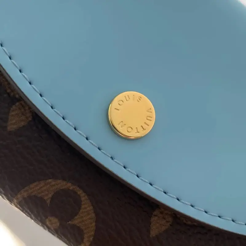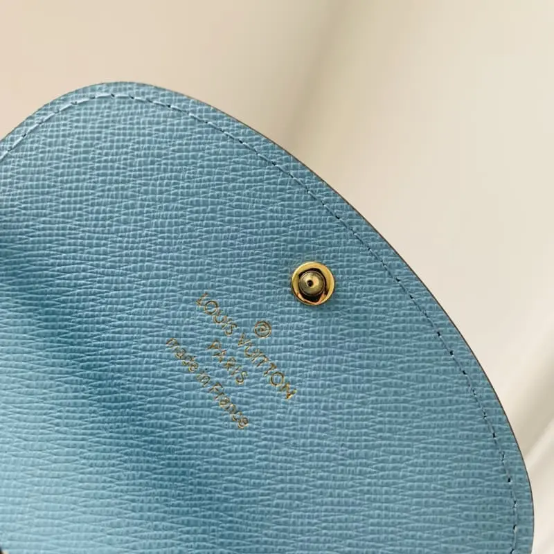 M82333 (blue) This Rosalie coin purse is made of Monogram and Monogram Reverse canvas. It opens with a rounded flap with an inscribed snap button and features an inner patch pocket, a zippered coin pocket, a card compartment and a back patch pocket. Dimensions: 11 x 8 x 2.5 cm