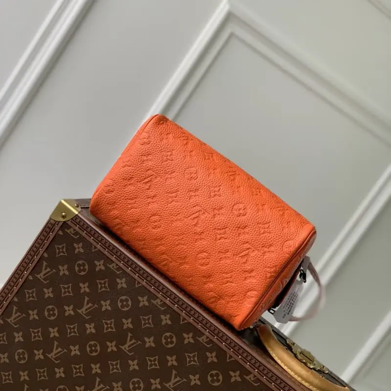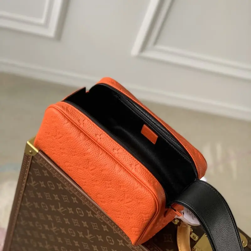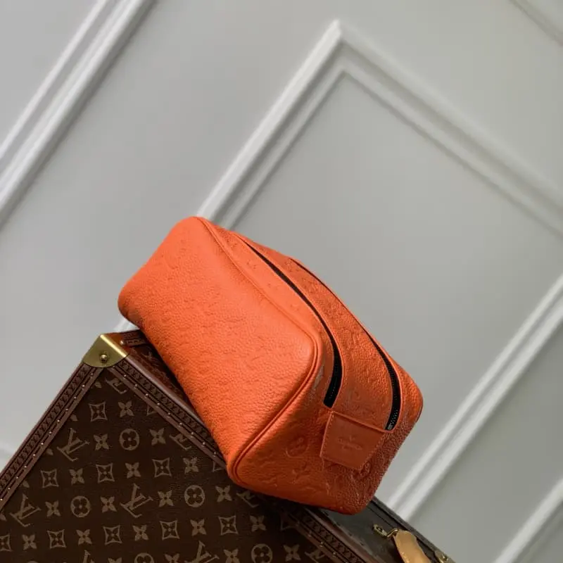 M82576 Embossed Orange This color is made of top-grain cowhide leather, and the Dopp Kit toiletry bag is made of grained Taurillon leather with embossed Monogram pattern. The double zipper wide mouth design and washable lining can properly store and carry toiletries. The stable handle is easy to hang on the bathroom hook. Dimensions: 28 x 15 x 16.5 cm