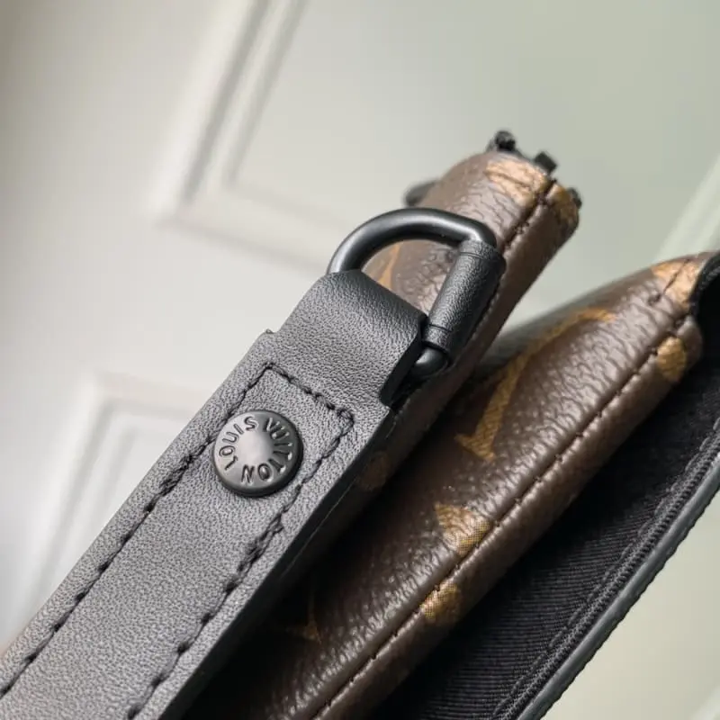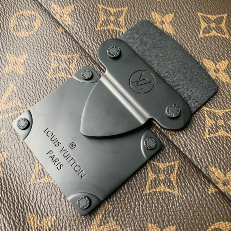 The M82598 Pochette S-Lock Clutch is made of Monogram Eclipse canvas and leather trims. The S-Lock magnetic clasp recalls the sturdy luggage lock design created by Georges Vuitton in the 1880s. Pockets for organized storage and a removable wrist strap. Dimensions: 28 x 22.5 x 3.5 cm