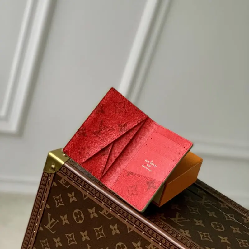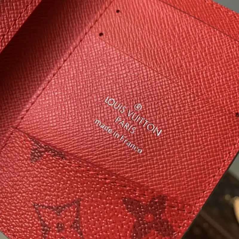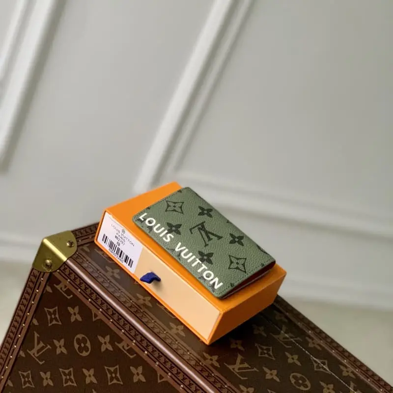 M82797 Green pocket wallet with Monogram coated canvas and contrasting color inner layer exudes trendy style. The vertical Lbag logo is marked on one side. The card compartment, inner pocket and outer patch pocket highlight the functional considerations in the exquisite configuration. Dimensions: 7.5 x 11.1 x 1.0 cm
