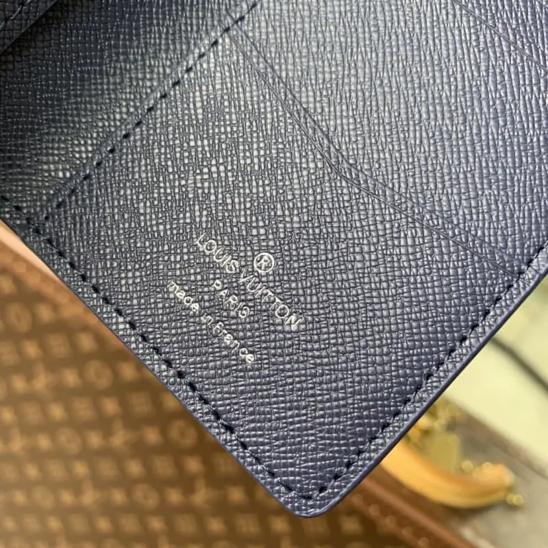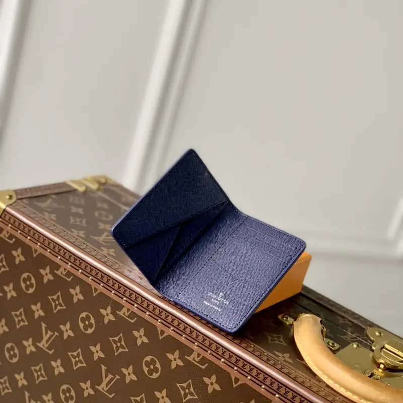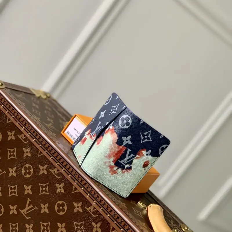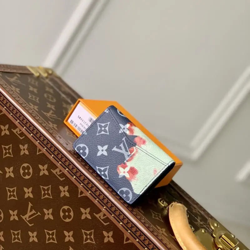 M82827 Fire Mountain This pocket wallet is made of Monogram coated canvas and contrasting color inner layer, exuding a trendy style. The vertical Lbag logo is marked on one side of the card compartment, inner pocket and outer patch pocket, highlighting the functional considerations in the exquisite configuration. Dimensions: 7.5 x 11.1 x 1.0 cm