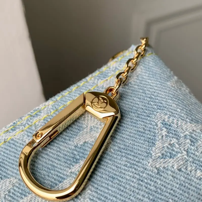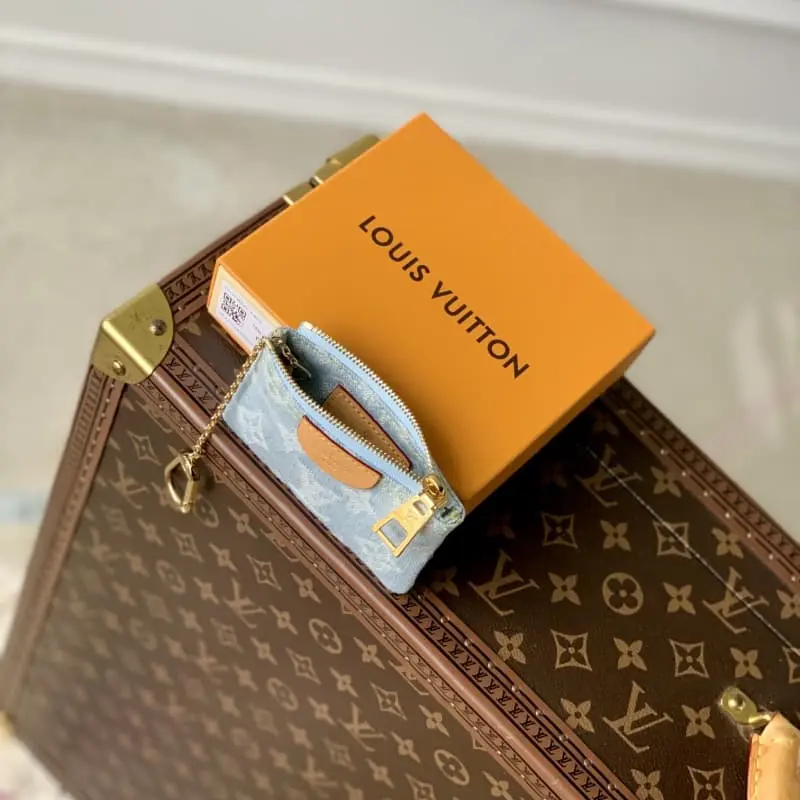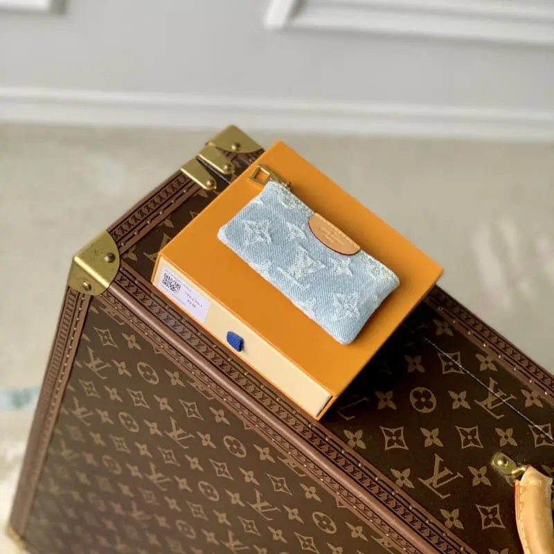 M82961 Light Denim This key coin purse is made of Monogram jacquard denim with matching calfskin trim . The classic Monogram DLd pattern is reinterpreted using jacquard weave technology and created a stonewashed washed denim effect. 12 x 7 x 1.5 cm.