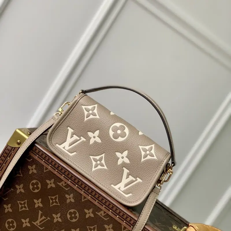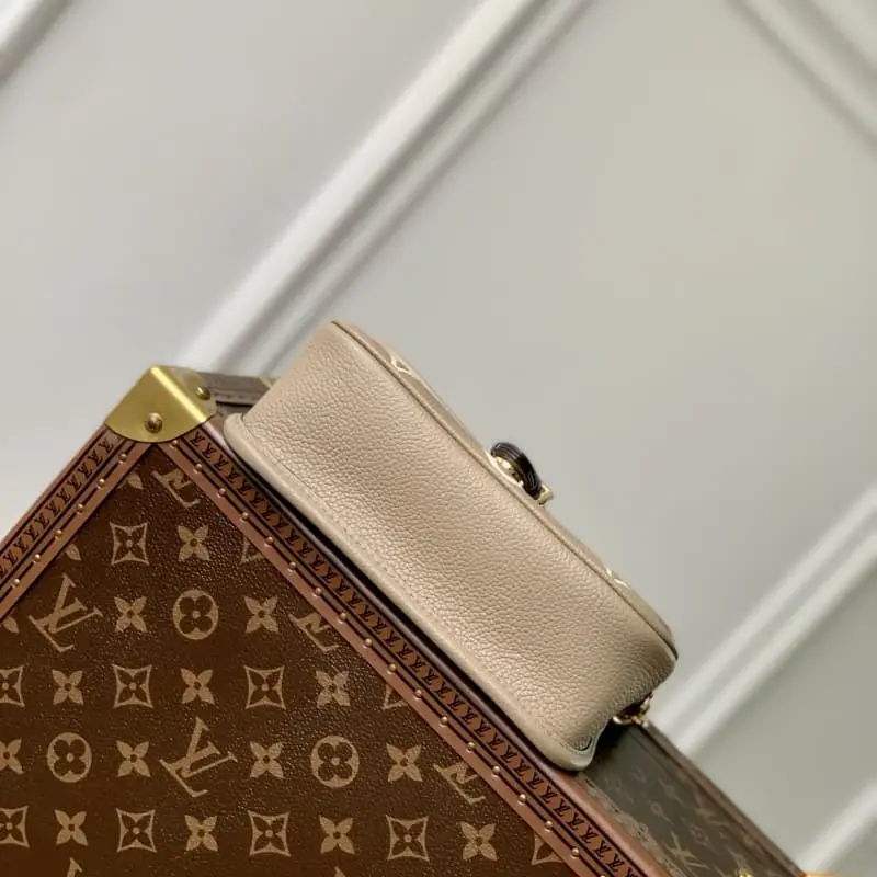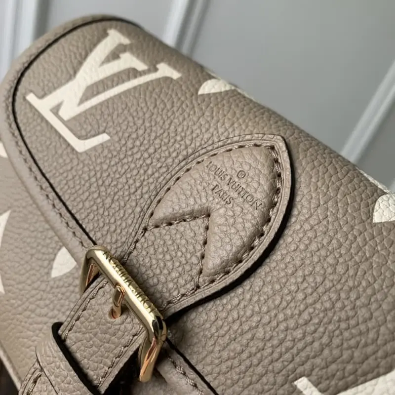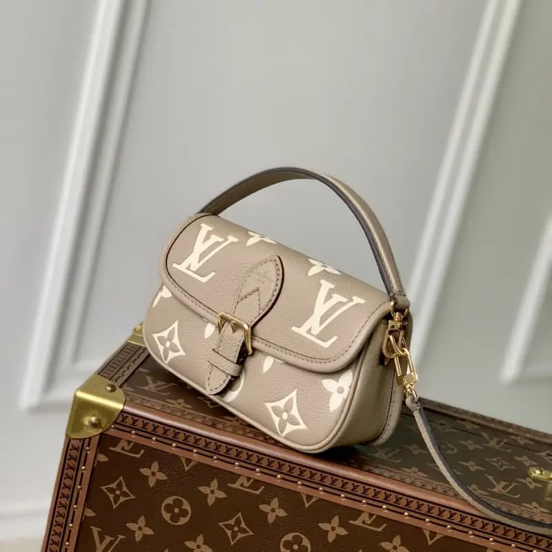 M83300 This Nano Diane bag condenses the classic Diane shape in a two-tone Monogram Empreinte leather. The rounded flap, sophisticated trim and belt-style magnetic closure are iconic details of the original. The removable handle and removable and adjustable shoulder strap allow for multiple carrying options. 19 x 10.5 x 6 cm (length x height x width)