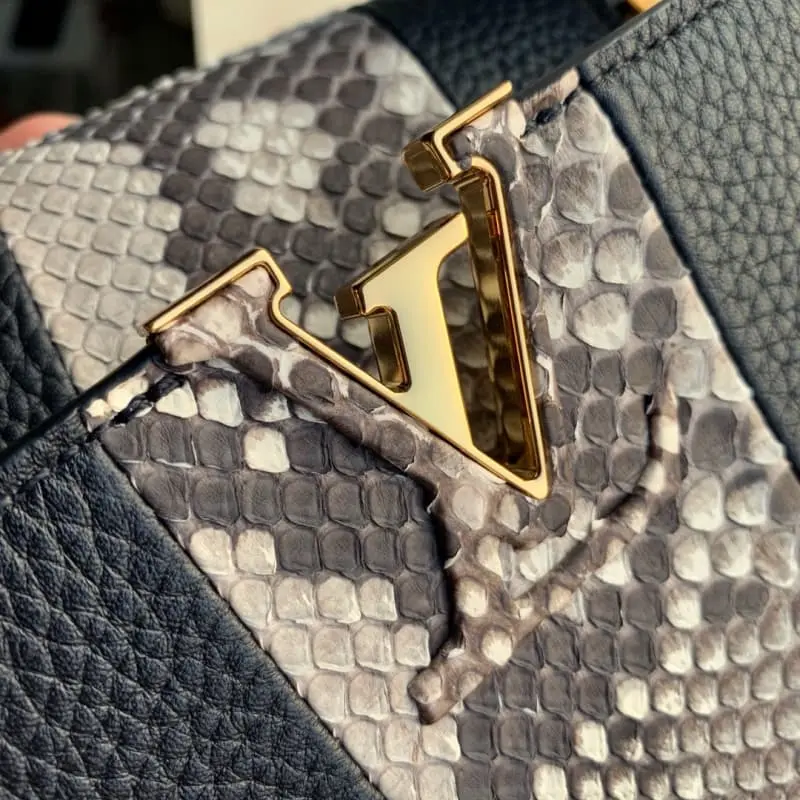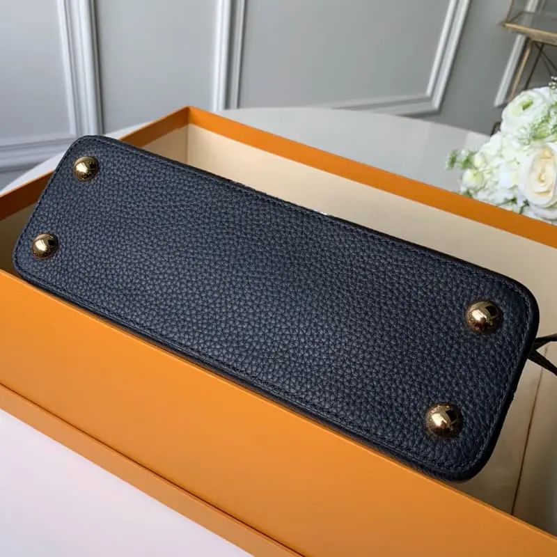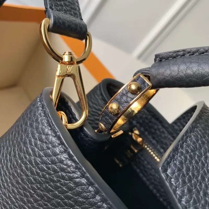 The Capucines BB Mini Bag M90199 is a stylish mini size and trendy bright colors that perfectly match all styles from classic to avant-garde. The Capucines BB Mini Bag is decorated with shiny palladium and comes with a removable long bag strap for casual shoulder or crossbody carry. Size 27.0 x 21.0 x 10.0 cm