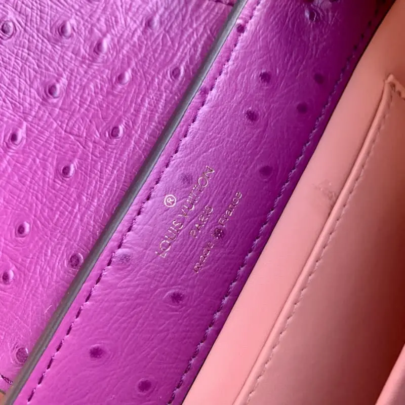 [Exclusive real shot of M93483 ostrich pattern purple mini] Capucines small handbag French imported calfskin, shiny metal accessories, unique Capucines flap can be put inside the bag to display the letter logo, and can be turned out to show the Monogram Flower pattern size: 21x14x8 cm