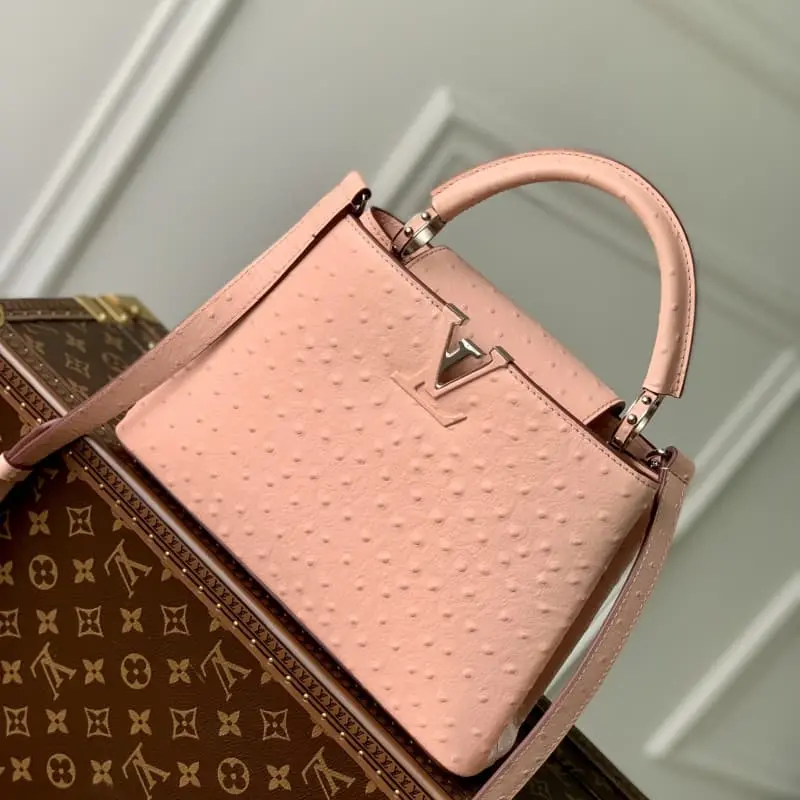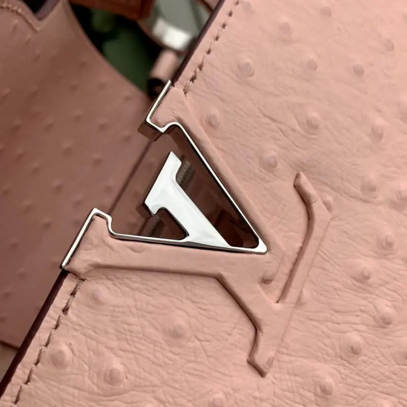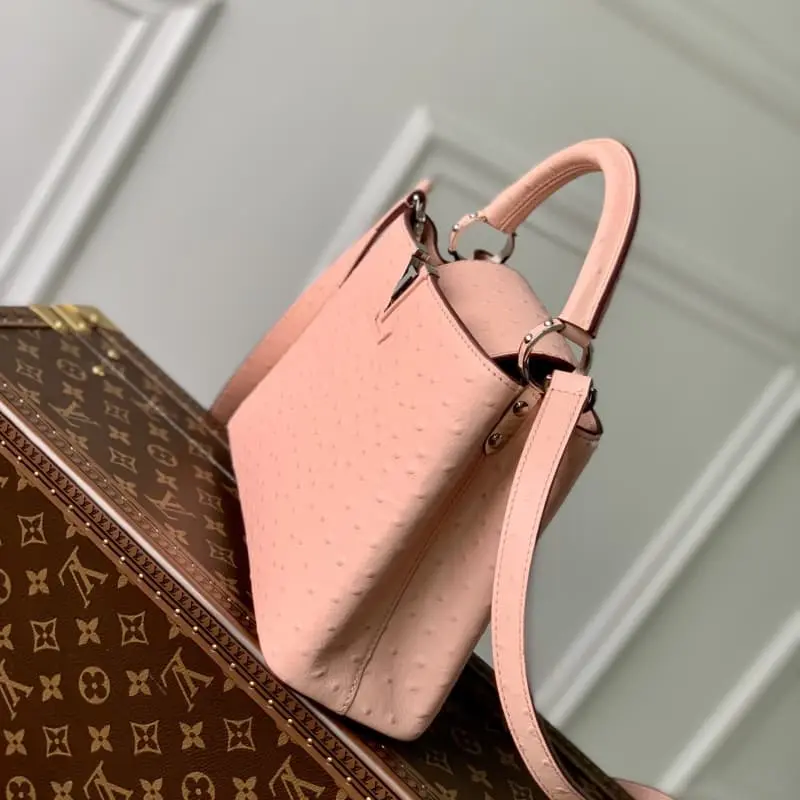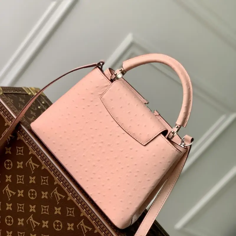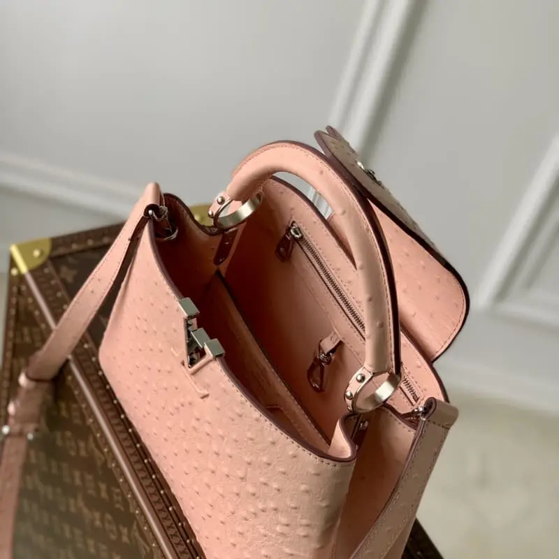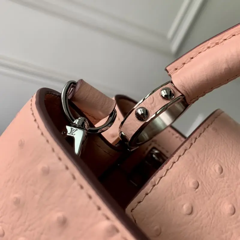 [ M93483 Ostrich pattern pink small] Capucines small handbag French imported calfskin, shiny metal accessories, unique Capucines flap can be put inside the bag to display the letter logo, or turned out to show the Monogram Flower pattern size: 27??18??9 cm