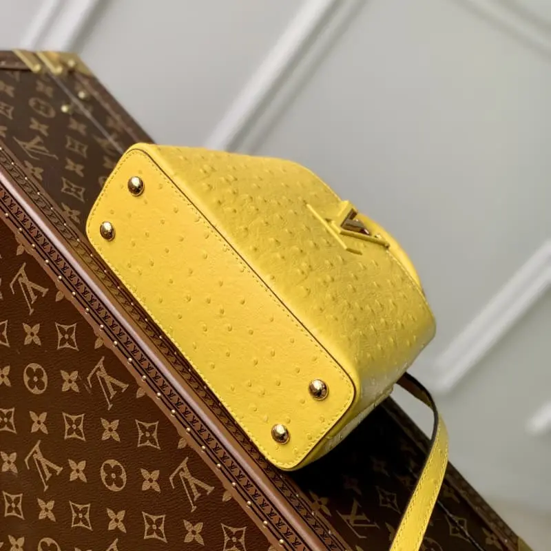 [ M93483 Ostrich pattern yellow mini] Capucines mini handbag French imported calfskin, shiny metal accessories, unique Capucines flap can be put inside the bag to display the letter logo, or turned out to show the Monogram Flower pattern size: 21x14x8 cm