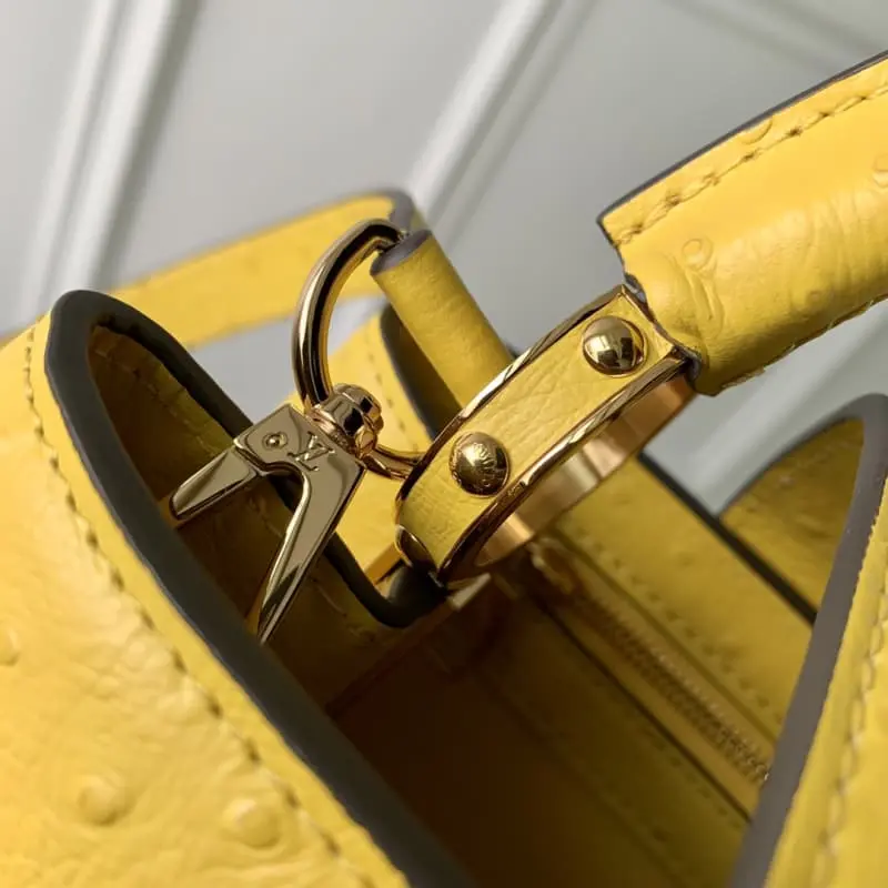 M93483 Ostrich pattern yellow small Capucines small handbag French imported calfskin, shiny metal accessories, unique Capucines flap can be put inside the bag to display the letter logo, or turned out to show the Monogram Flower pattern size: 27??18??9 cm