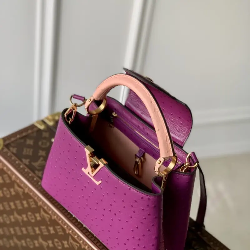 Exclusive real shot M93483 Ostrich pattern purple small size] Capucines small size handbag French imported calfskin, shiny metal accessories, unique Capucines flap can be put inside the bag to display the letter logo, and can be turned out to show the Monogram Flower pattern size: 27??18??9 cm