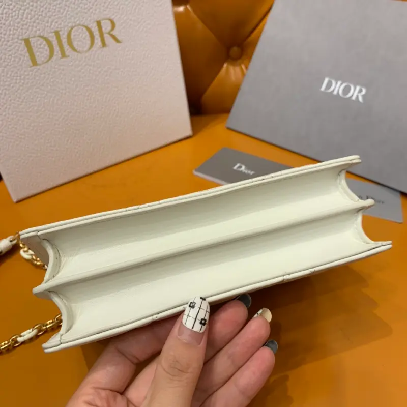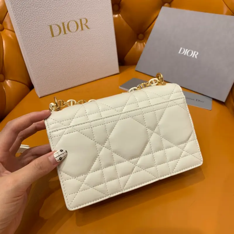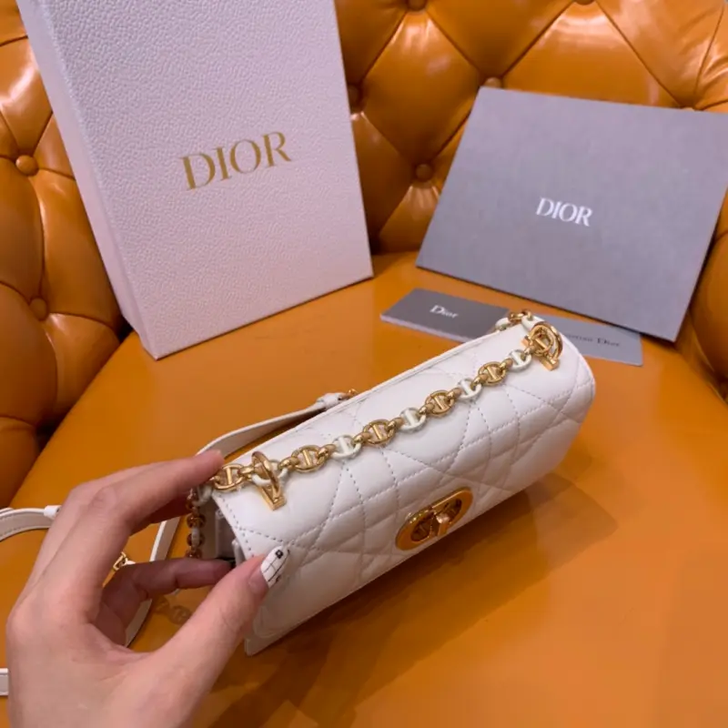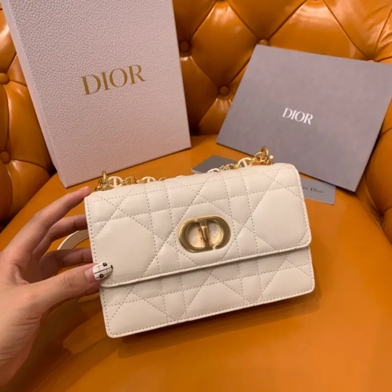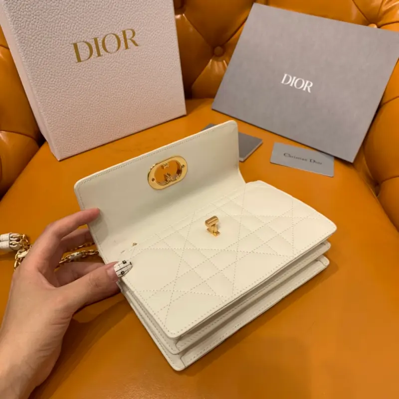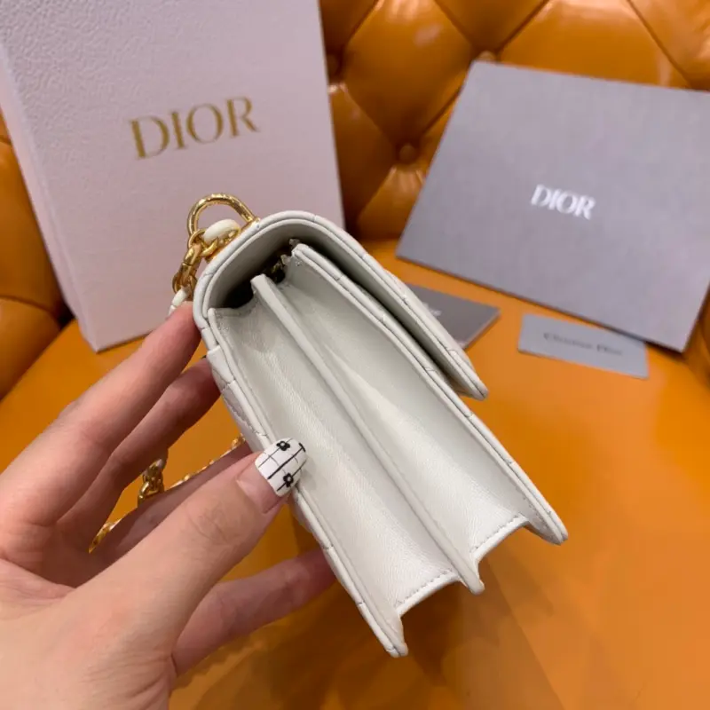 The Miss Caro chain series in white is carefully crafted with imported sheepskin. The unique quilted effect and oversized rattan check pattern are eye-catching. The flap is embellished with a gold-finished metal knob buckle and is paired with a detachable chain shoulder strap. It is made of gold-finished metal links and enamel links in the same color as the leather, which are alternately created with a leather strap for added comfort. The overall look is both advanced and elegant. Size: 19*5.5*13cm