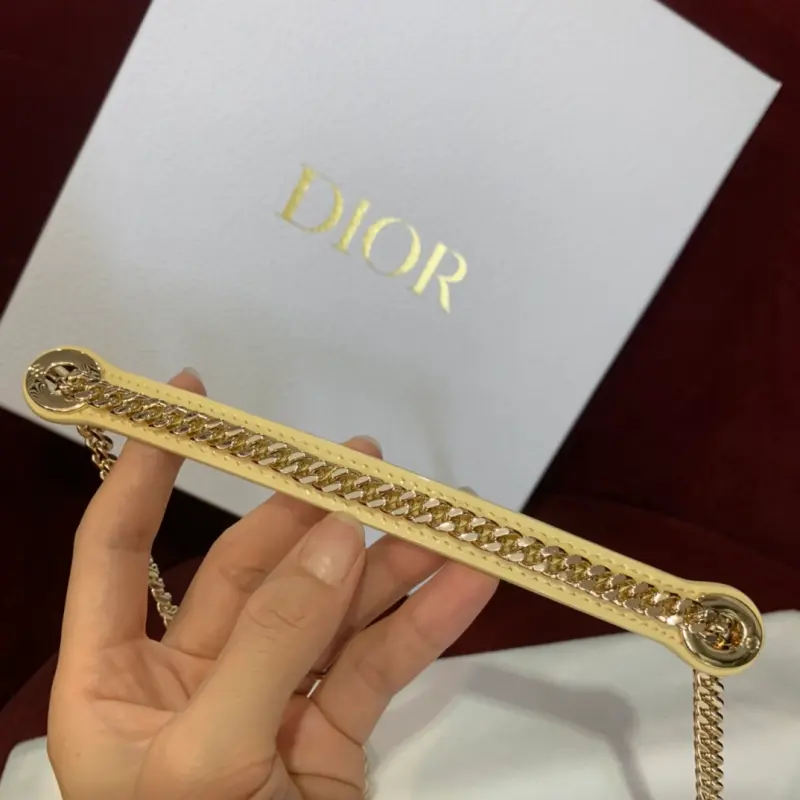 Upgraded version of the chicken yellow Lady Cannage patent leather mini handbag with chain and light gold metal accessories. Long chain with Cannage stitching decoration. Detachable long chain with light gold hardware. Can be carried by hand, shoulder or crossbody. Size: ** (