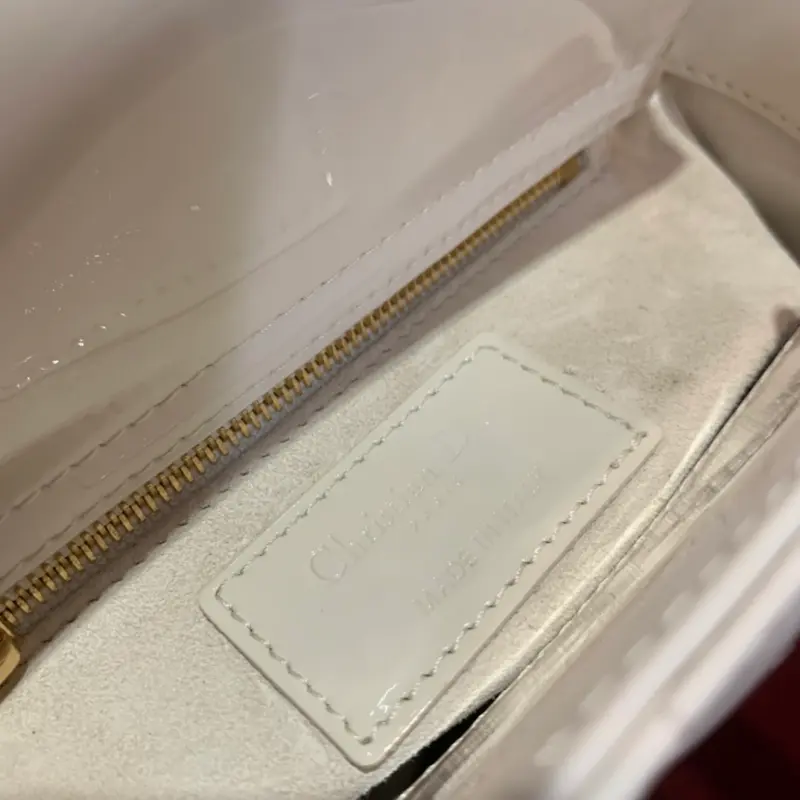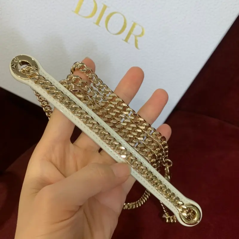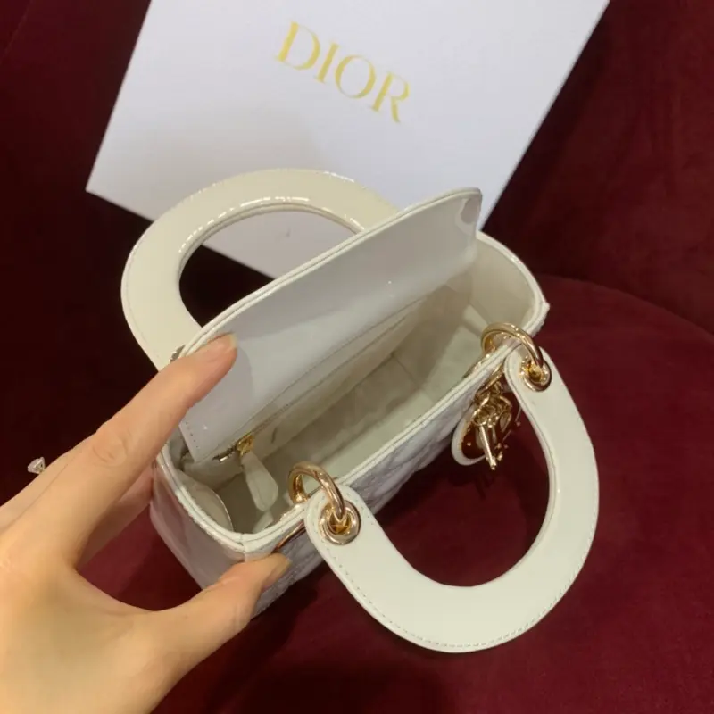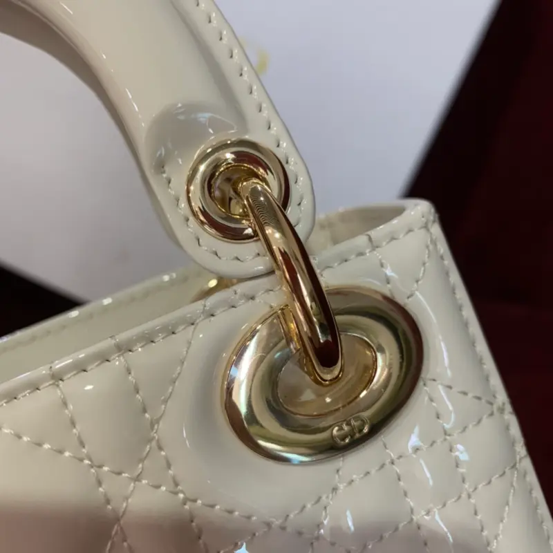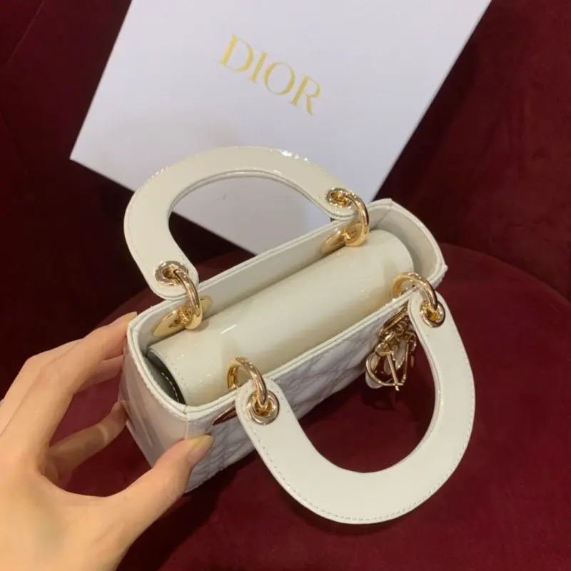 Creamy white Lady mini bag in patent leather with cannage pattern. Chain and light gold hardware. Long chain strap with cannage pattern stitching. Detachable long chain strap with light gold hardware. Can be carried by hand, on the shoulder or across the body. Size: **