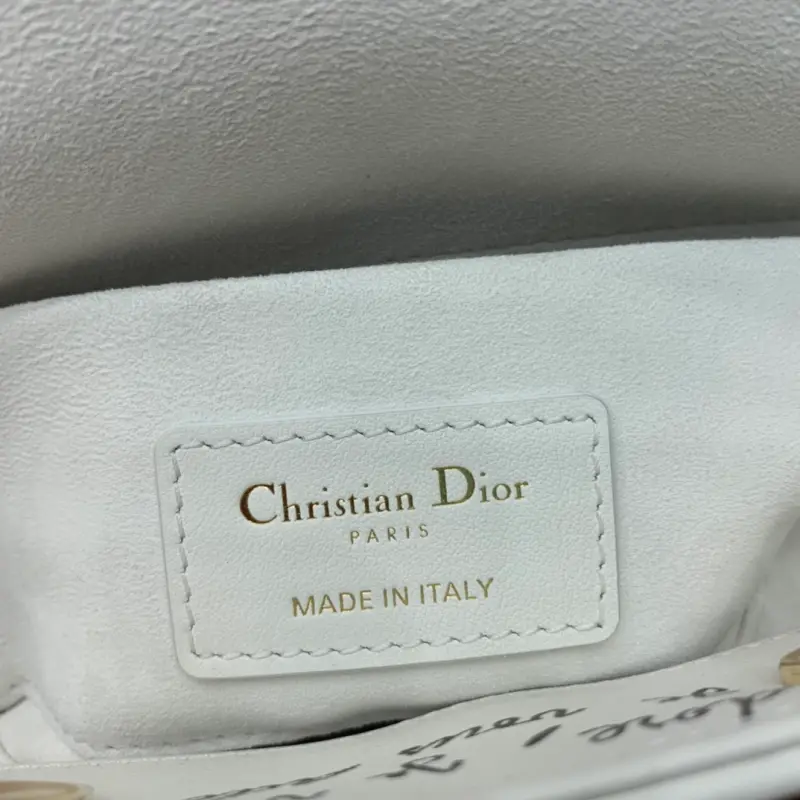 The D-Joy Dbagamour limited edition collection highlights the classic minimalist aesthetic of the Lady Dbag collection and embodies Dbag’s profound insight into elegance and beauty. Crafted from white cowhide leather, it is embellished with a black and red Je Vous Adore (I Love You) pattern, inspired by Marc Bohan’s Dbag design archive. The light gold-finished metal Dbag charm is embellished with a red enamel heart charm for a more refined look. The small size, with a detachable chain shoulder strap and an adjustable and detachable leather shoulder strap, can be carried by hand, on the shoulder or across the body, making it an ideal choice for everyday looks. It can also be easily paired with other Dbagamour items to create a matching look. Detachable chain shoulder strap Detachable and adjustable leather shoulder strap Internal slip pocket Dust bag included Made in Italy Dimensions: 22??12??6