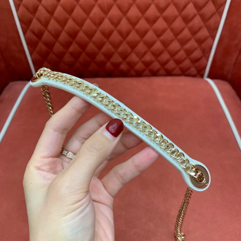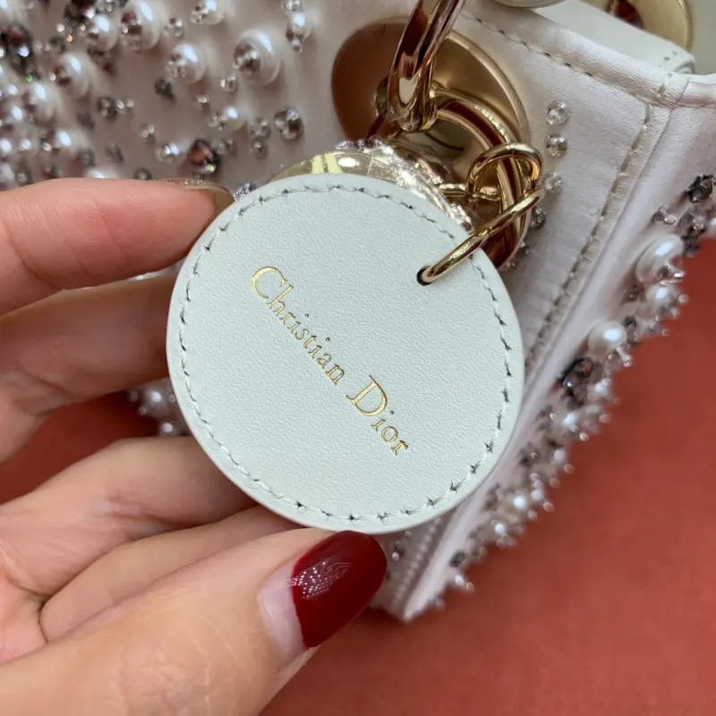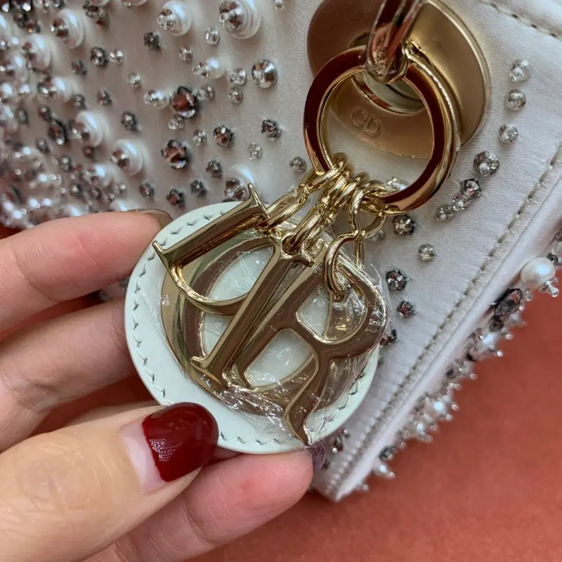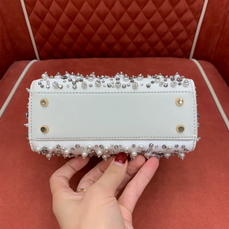This bag, embroidered with three panels of diamonds and pearls and lined with sheepskin, epitomizes Dbag’s profound understanding of elegance and beauty. The delicate craftsmanship of large and small diamonds and pearls creates a chic and timeless design. Hand-embroidered beads throughout, accented with a light gold-finished metal Dbag charm, add a touch of movement to the exquisite silhouette. The miniature design features a detachable chain shoulder strap, allowing it to be carried by hand or worn cross-body, making it the ideal companion for evening wear. Dimensions: 17 x 15 x 7 cm
