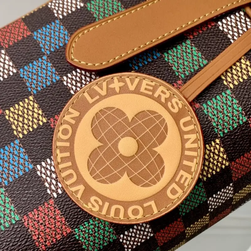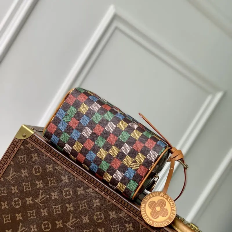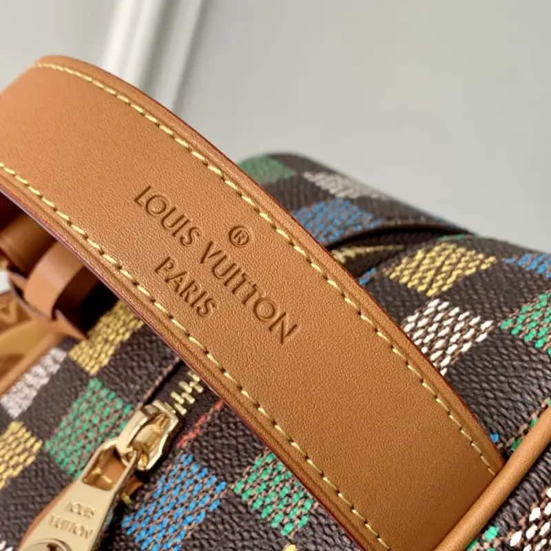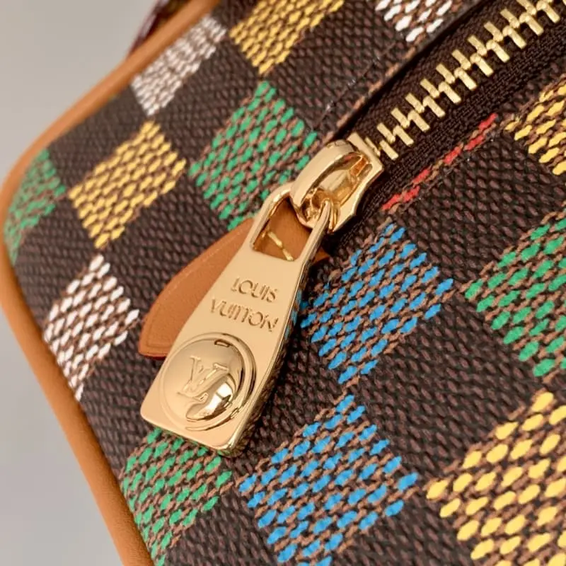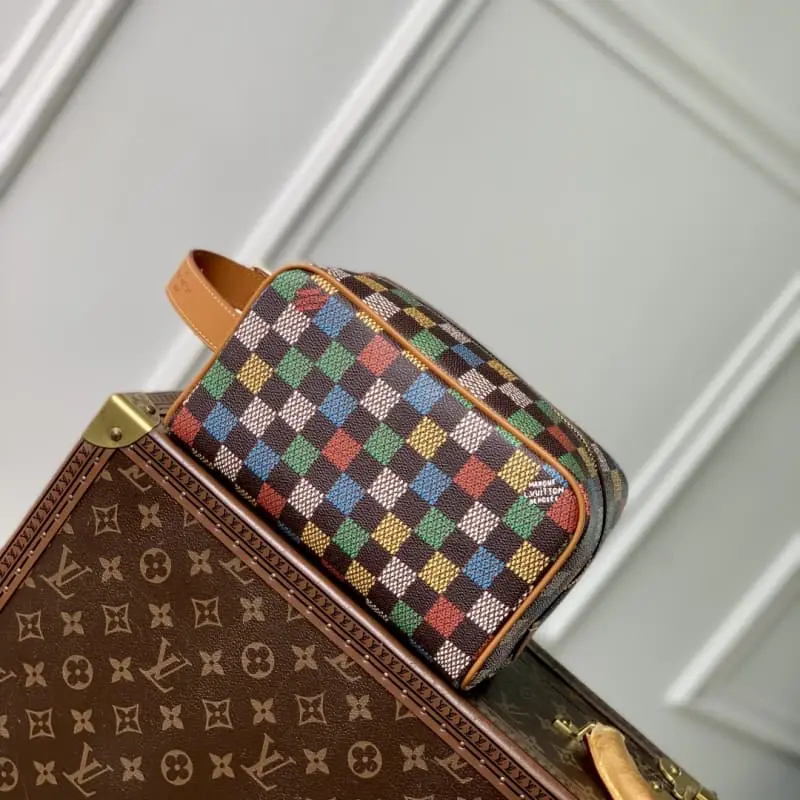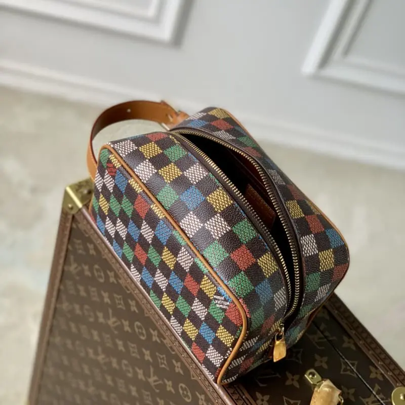 N00151 LOCKER DOPP KIT Toiletry bag made of LVers Damier Ebene canvas The colorful check pattern seems to be painted on the Damier Ebene pattern. The handle is made of cowhide leather. The bag body is equipped with a removable spherical LVERS UNITED charm. With a spacious zipper and washable fabric lining, it is suitable for storing toiletries. 13 x 12 x 23 cm