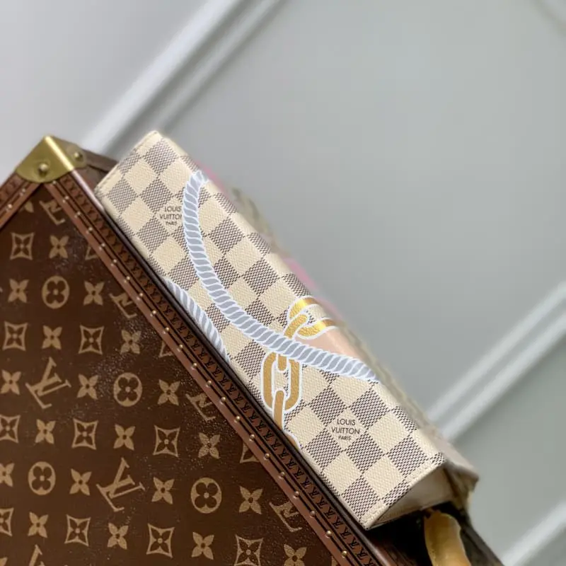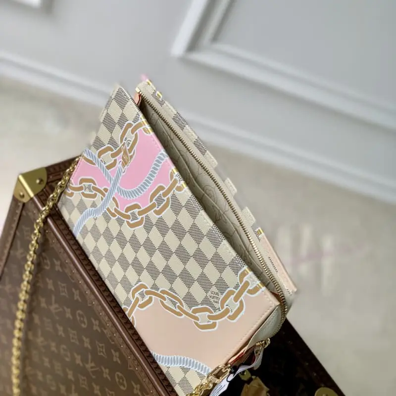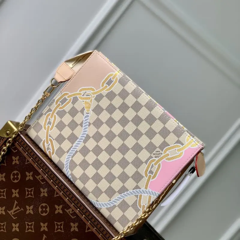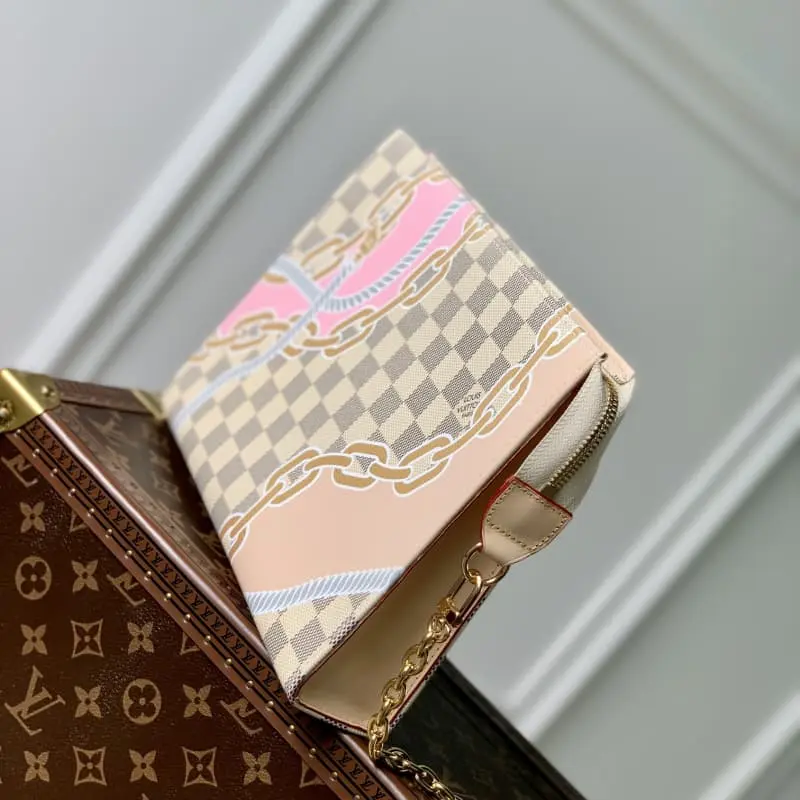 N40469 white checkered silk screen! TOILETRY POUCH ON CHAIN Toiletry Pouch On Chain is based on the Monogram Toiletry Pouch, which was created in 1901 and can be used as a clutch. It is paired with leather trim and a detachable chain and can be carried by hand or on the shoulder. The small internal storage bag can be used separately. Size: 25 x 20 x 5.5 cm