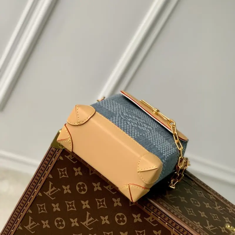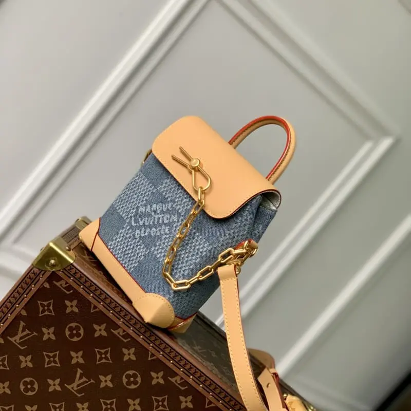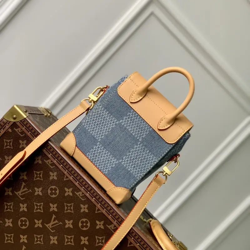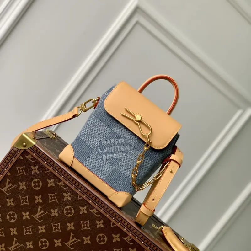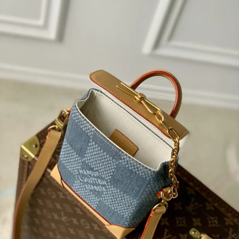 N40751 The Nano Steamer Bag draws inspiration from the Steamer Bags of the early 20th century. The soft Damier Denim 3D cotton canvas designed by Pharrell Williams is used to create a compact city bag configuration. The cowhide leather trim, handles and shoulder strap complete the elegant design. 15 x 18 x 7 cm (length x height x width)