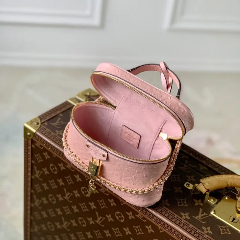 N85820 Pink Inspired by traditional vanity cases, this ostrich-patterned vanity chain bag embodies the spirit of travel. This sophisticated, slender bag features a removable braided chain and leather shoulder strap. It is known for its rich signature details, including a padlock engraved with the LV logo and a keychain in the same material. 19 x 11.5 x 6.5 cm (L x H x W)