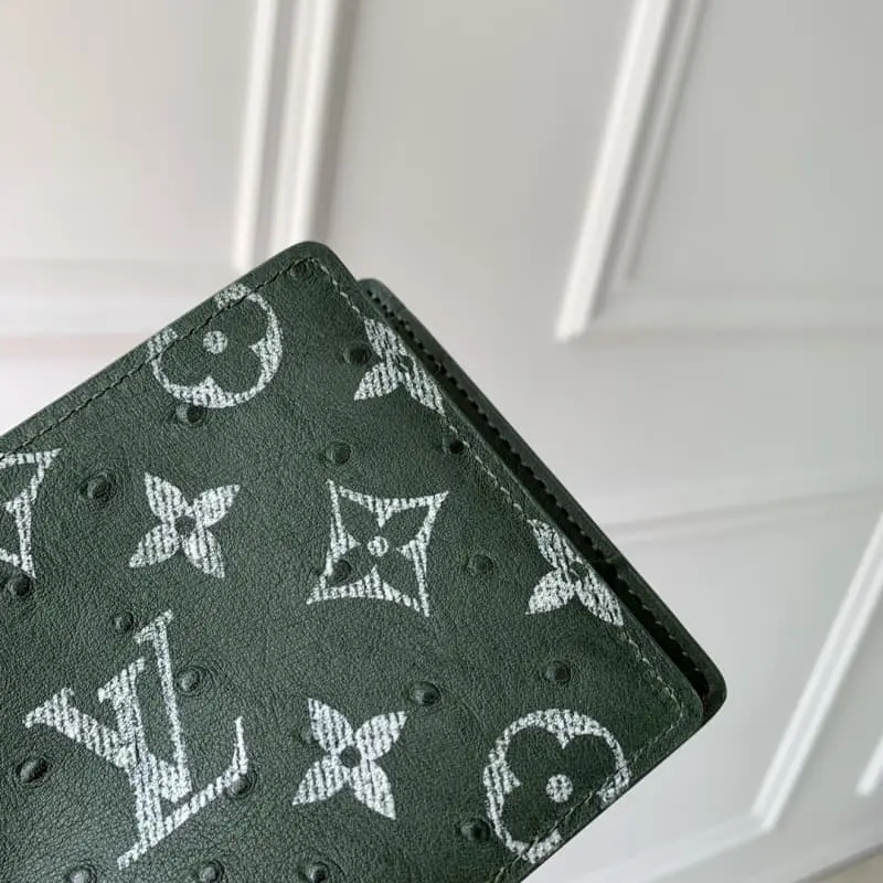 N85942 Ostrich pattern short wallet This short wallet uses gorgeous ostrich leather to show Lbag’s profound attainments in leather making. Bright colors inject high vitality into the card sandwich, compartment and zipper coin pocket. Rich functional design. 12 x 9 x 1 cm (length x height x width).
