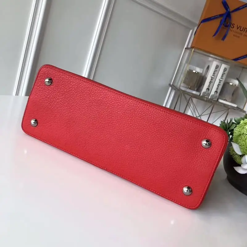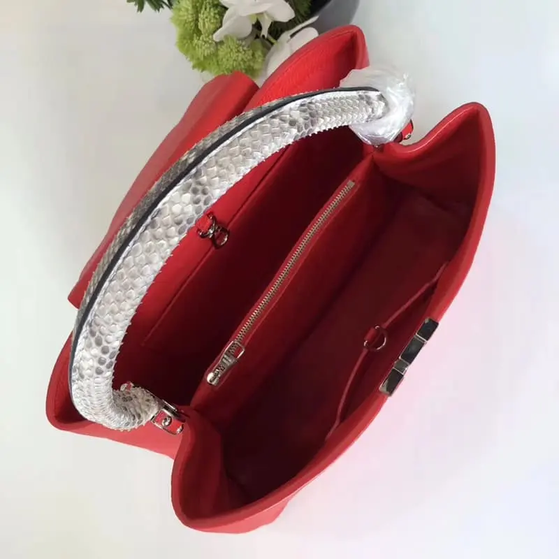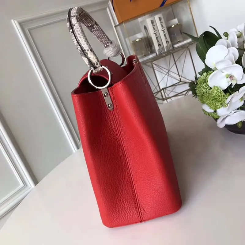 N91899 Lbag Capucines medium handbag imported genuine snakeskin is now available. The Capucines medium handbag is a perfect match for all styles from classic to avant-garde with its stylish mini size and trendy bright colors. This handbag is decorated with shiny palladium and is suitable for casual shoulder carry. Size: 36 x 23 x 14 cm Imported lychee grain cowhide with pure sheepskin lining Original hardware The best quality in the market! Welcome to compare