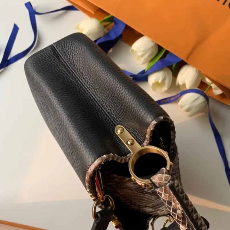 N95509 CAPUCINES BB Handbag This Capucines BB handbag uses python skin to embellish the timeless black Taurillon leather. The exotic python pattern wraps the corner of the LV logo and spreads to the surface of the flap, outlining the elegant outline of the Capucines handbag’s opening and closing. The handle is fixed with a ring and decorated with gold studs. Dimensions: 27.0 x 18.0 x 9.0 cm (length x height x width) Black Taurillon leather and python leather Taurillon leather trim Calfskin lining Gold metal parts Handle handle Removable shoulder strap Can be carried on the shoulder or across the body Strap length: 20 inches to 22 inches The flap can be placed inside or outside the compartment Equipped with a patch pocket Spring buckle to prevent items from slipping 4 bottom studs