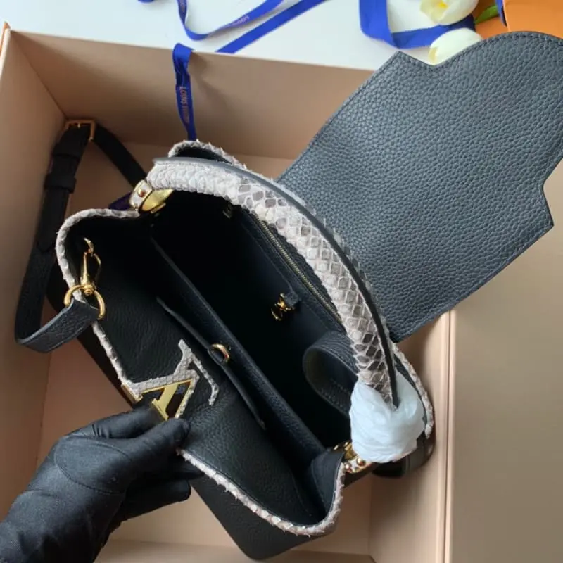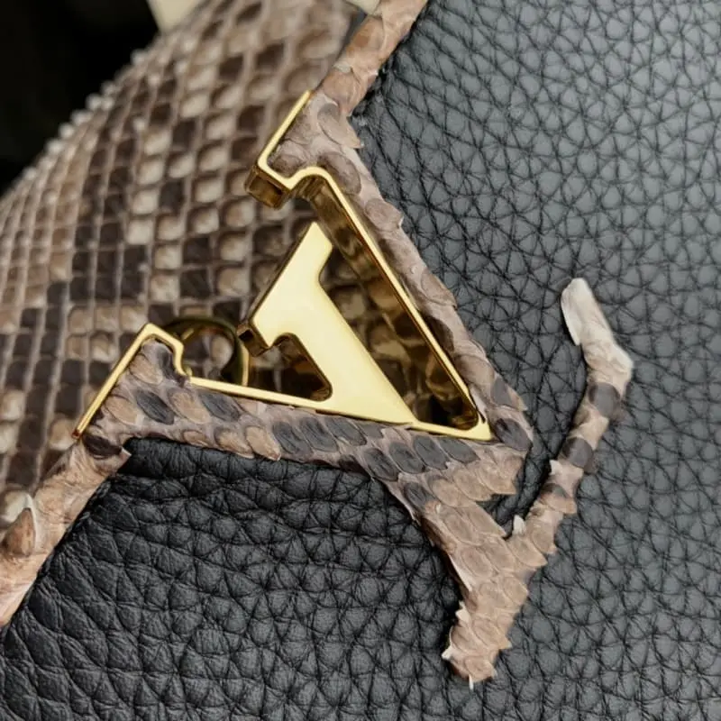 N95509 CAPUCINES BB Medium Handbag This Capucines BB handbag is made of python skin to embellish the timeless black Taurillon leather. The exotic python pattern wraps the corner of the LV logo and spreads to the surface of the flap, outlining the elegant outline of the Capucines handbag’s opening and closing. The handle is fixed with a ring and decorated with gold studs. Dimensions: 31.5x 20.0x 11.0cm (length x height x width) Black Taurillon leather and python leather Taurillon leather trim Calfskin lining Gold metal parts Handle handle Removable shoulder strap Can be carried on the shoulder or across the body Strap length: 20 inches to 22 inches The flap can be placed inside or outside the compartment Equipped with a patch pocket Spring buckle to prevent items from slipping 4 bottom studs