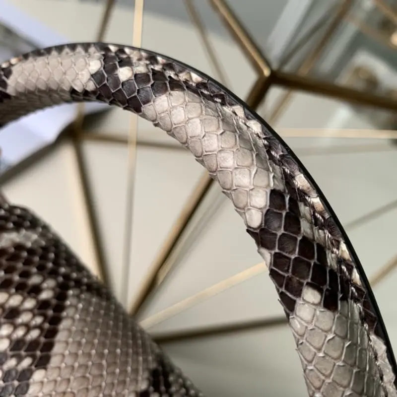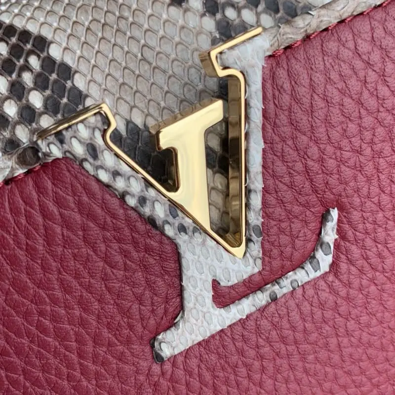N95509 Purple CAPUCINES BB Handbag This Capucines small handbag is made of python skin to embellish the timeless black Taurillon leather. The exotic python pattern wraps the corner of the LV logo and spreads to the surface of the flap, outlining the elegant outline of the opening and closing of the Capucines handbag. The handle is fixed with a ring and decorated with gold studs. Size: 27.0 x 18.0 x 9.0 cm